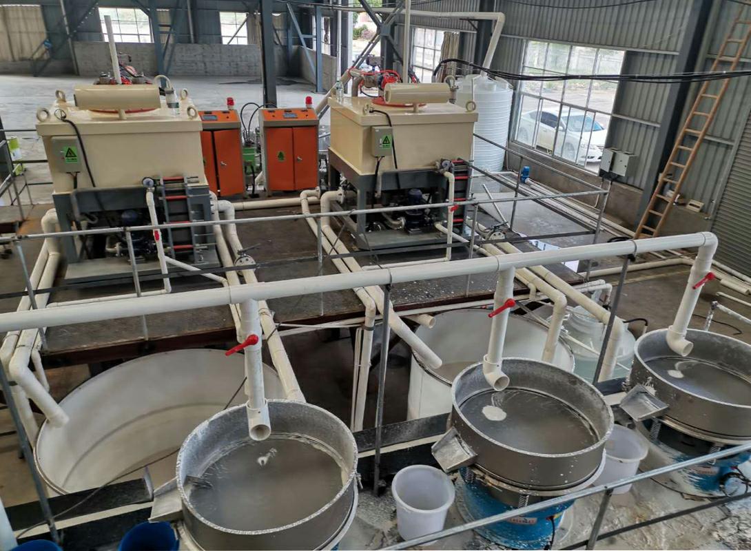 磁選機(jī)的分選原理,電磁高梯度磁選機(jī)是用銅線材質(zhì),干粉除鐵機(jī)放置裝有必定數(shù)量導(dǎo)磁介質(zhì)網(wǎng)(或水洗除鐵機(jī)放置鋼毛篩網(wǎng))的分選罐,線圈勵磁后,使導(dǎo)磁不銹鋼毛磁化,其外表發(fā)生高度不均勻的磁場,即高梯度的磁化磁場,順磁性物料通過分選罐中的鋼毛時,將遭到一個與外加磁場和磁場梯度的乘積成比例的磁場力,吸附在鋼毛外表,而非磁性物直接通過磁場,通過非磁性物閥門和管道,流入非磁性產(chǎn)品槽中。當(dāng)鋼毛捕收的弱磁性物到達(dá)必定程度時(由工藝要求決定),中止給礦。斷開勵磁電源、沖刷磁性物,磁性物通過磁性物閥門和管道,流入磁性產(chǎn)品槽中。然后進(jìn)行第二次作業(yè),如此循環(huán),循環(huán)往復(fù)。