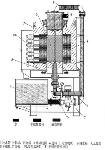 基于這種特殊結構,水冷電磁漿料自動除鐵機具有以下優(yōu)點:磁感應強度高;內部溫升小,長期運行磁感應強度不易衰減;單位工作時間產(chǎn)量高;對礦石給礦粒度、濃度適應性廣;選礦效率高;操作維修方便。