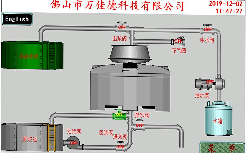 手動操作,在手動狀態(tài)時可以任意手動操作每一個動作。但在操作抽漿泵時,進漿出漿閥自動打開,在手動沖水閥時沖水電機會自動運行。由于回漿閥在停機閥門在開的狀態(tài),所以在進漿時要考慮是否要關(guān)閉回漿閥門,另在使用高位桶下料時,要求在停機后要手動打開進漿料閥,使得其管路里面的漿料能從回漿管流入回漿池,避免管路堵塞。