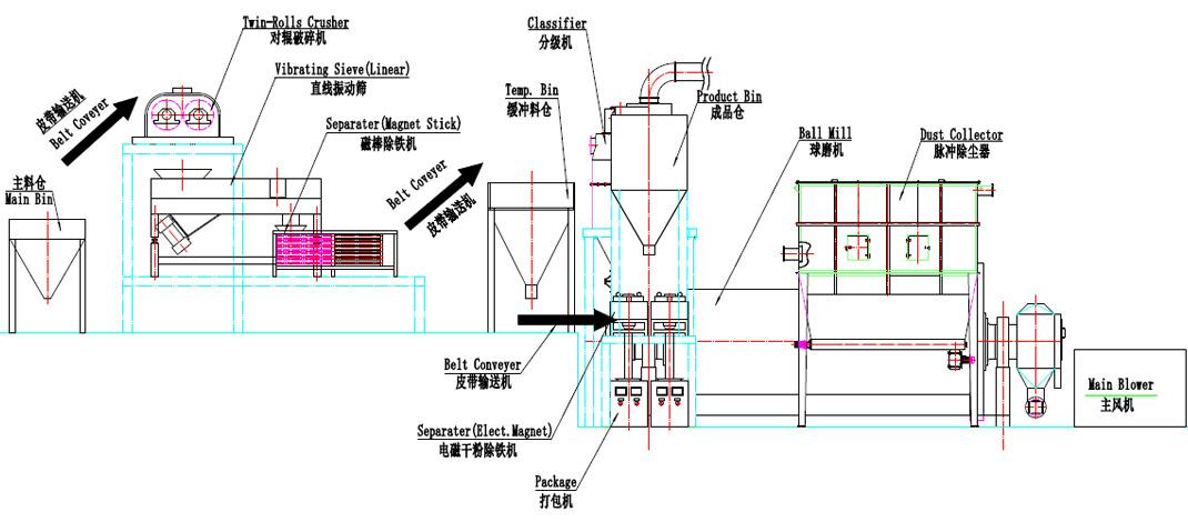非金屬礦物超細研磨,與一般的細度D97≥5um,如方解石、滑石、硅灰石等,在當前c超細研磨技術(shù)條件下,優(yōu)先選擇干燥超細研磨技術(shù)和干燥超細磨設(shè)備,如雷蒙機、分級機、輥式破碎機機、高速沖擊式破碎機、球磨機、振動磨機、混合機、等一些設(shè)備配置,選擇合適的干法超細磨設(shè)備,來生產(chǎn)滿足尺寸要求的產(chǎn)品。